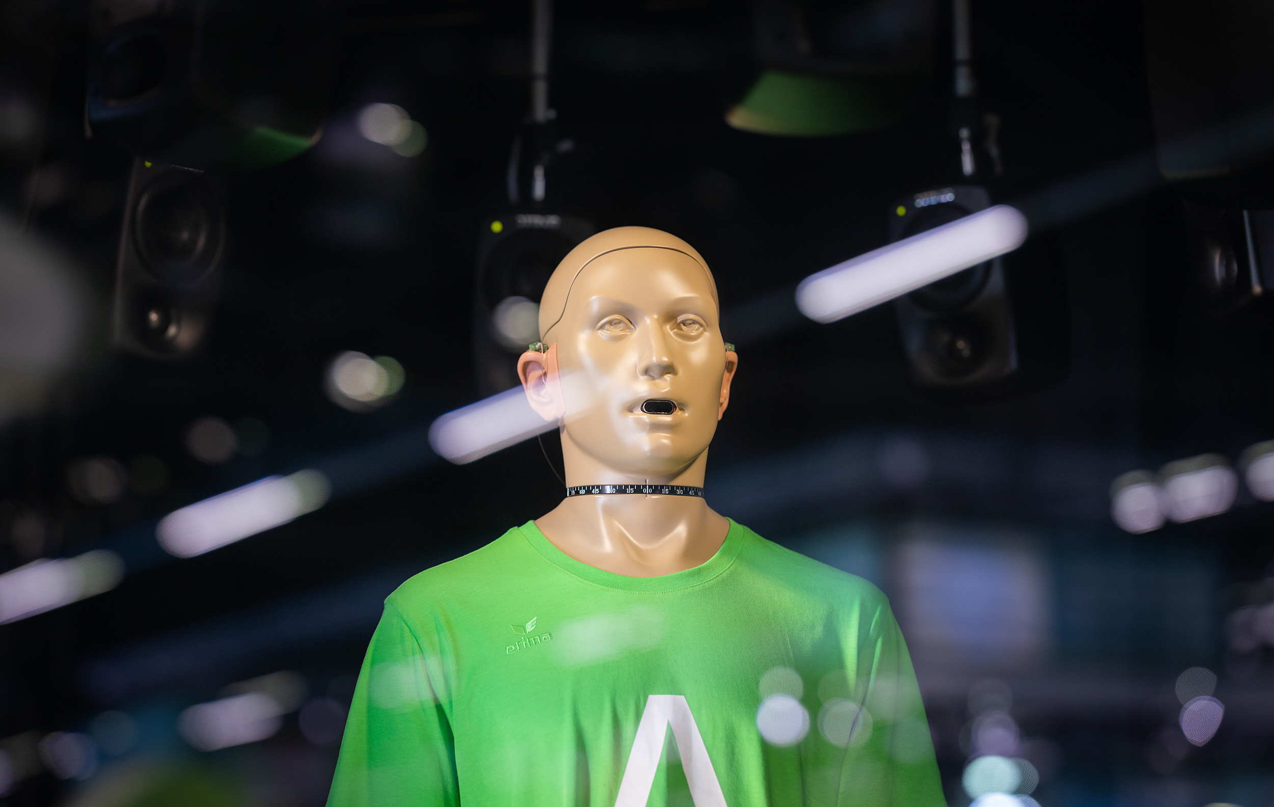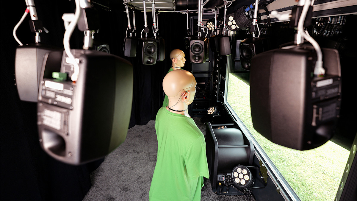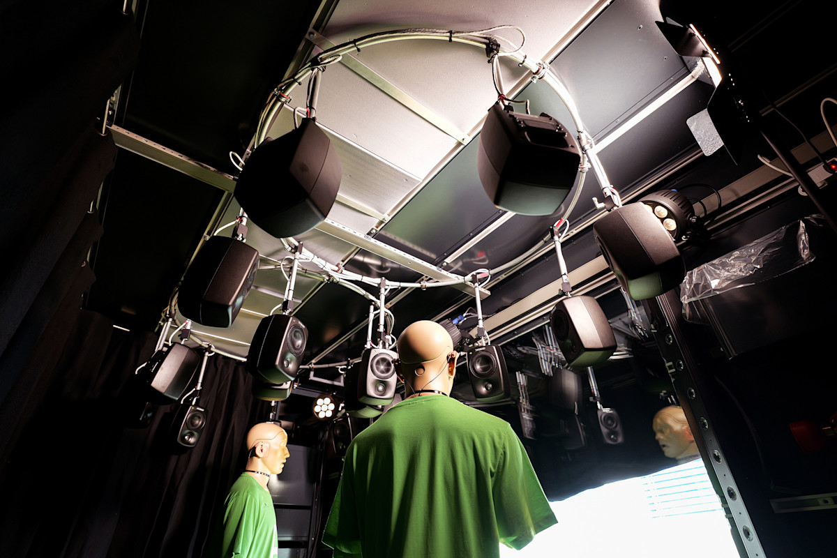 The two KEMARs are set up to highlight different features of the hearing aids, with visitors outside the container able to switch their headphones between the two in order to compare the audible benefit of each feature. “The two circles of 8x 4420s enable us to create an authentic 3D sound,” Hohl explains. “It’s powerful for showcasing how cutting-edge hearing aids handle real-world, spatially complex listening situations. The setup allows us to simulate experiences such as sound coming from multiple directions or group conversations.